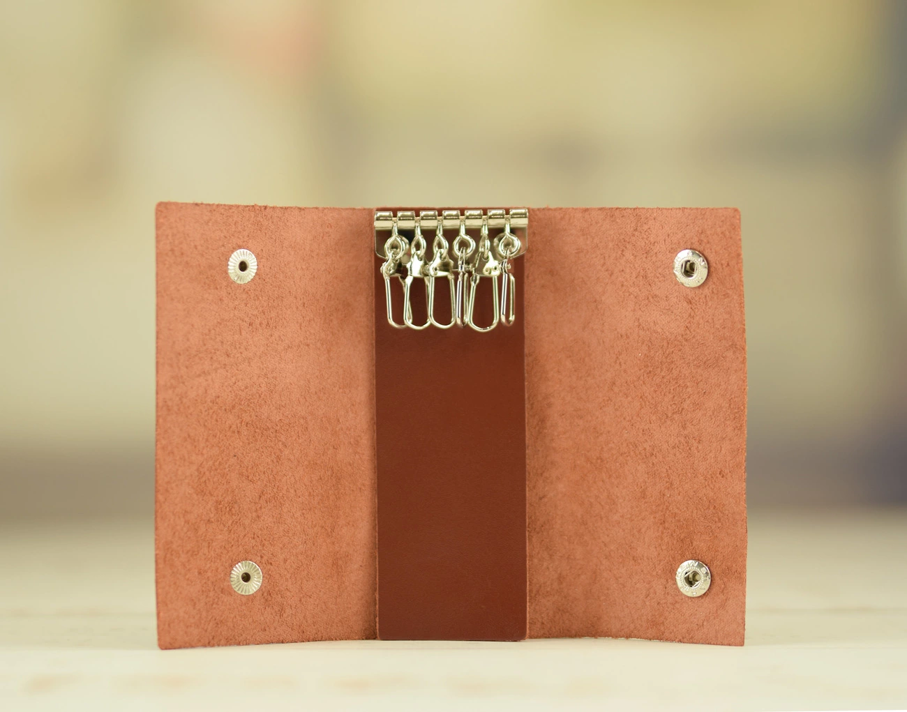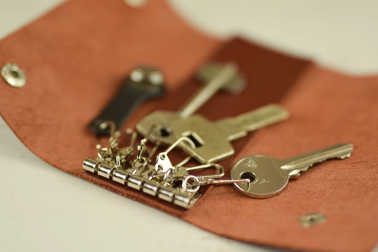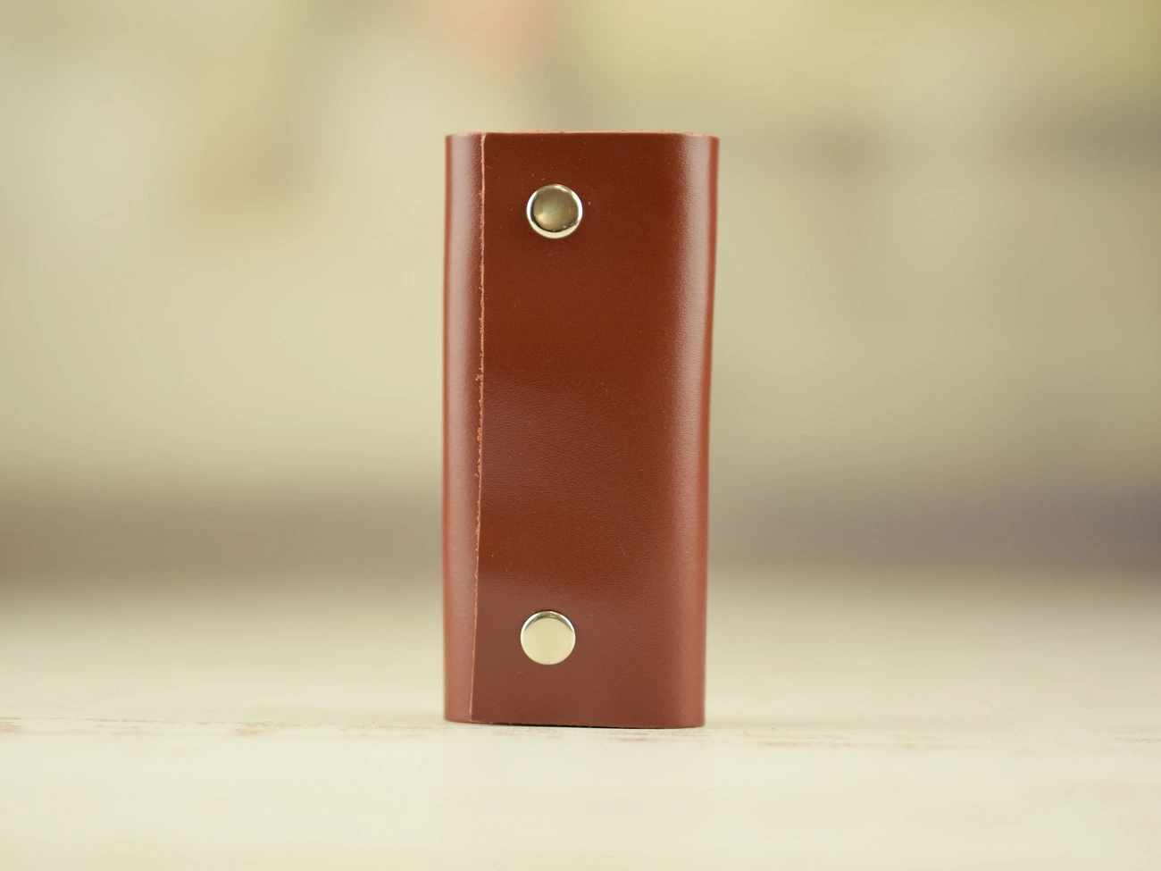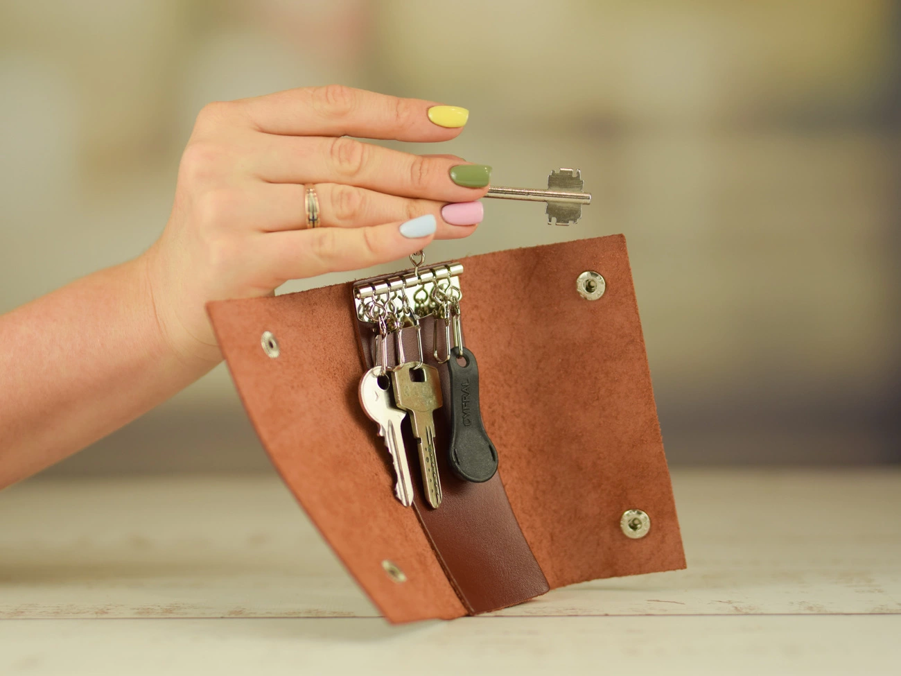 дві кнопки. Всередині є 6 кілець для 6 ключів. Розмір: 13,5х6х2