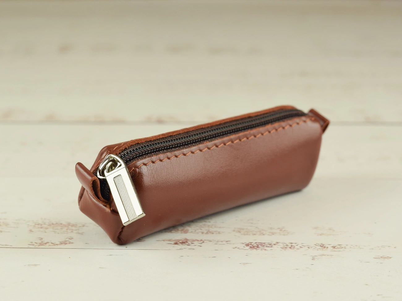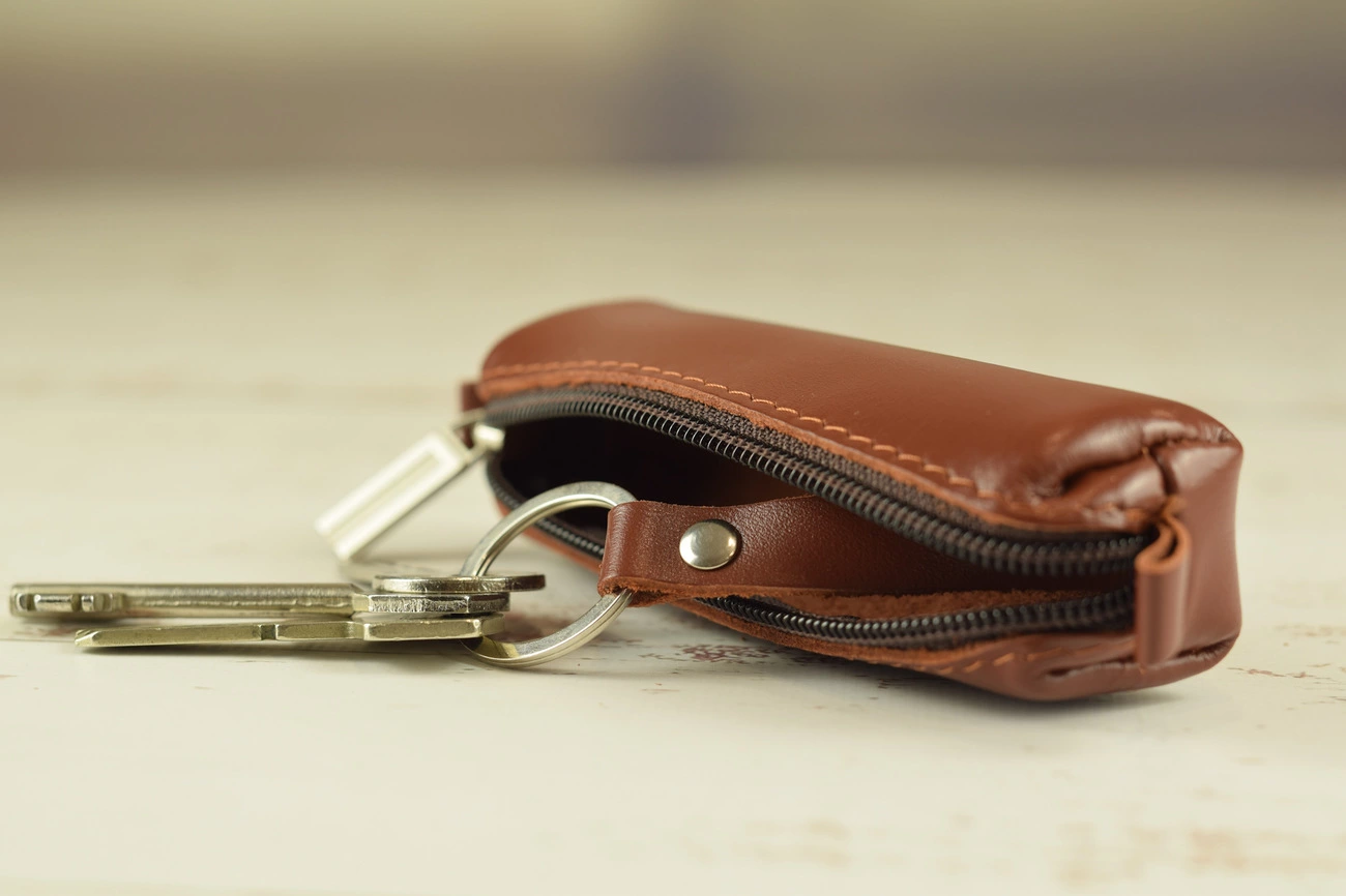 Ключниця закривається на блискавку. Усередині металеве кільце для фіксації коротких або довгих ключів. Ви можете замовити ключницю в будь-якому кольорів з нашої кольорової палітри.
