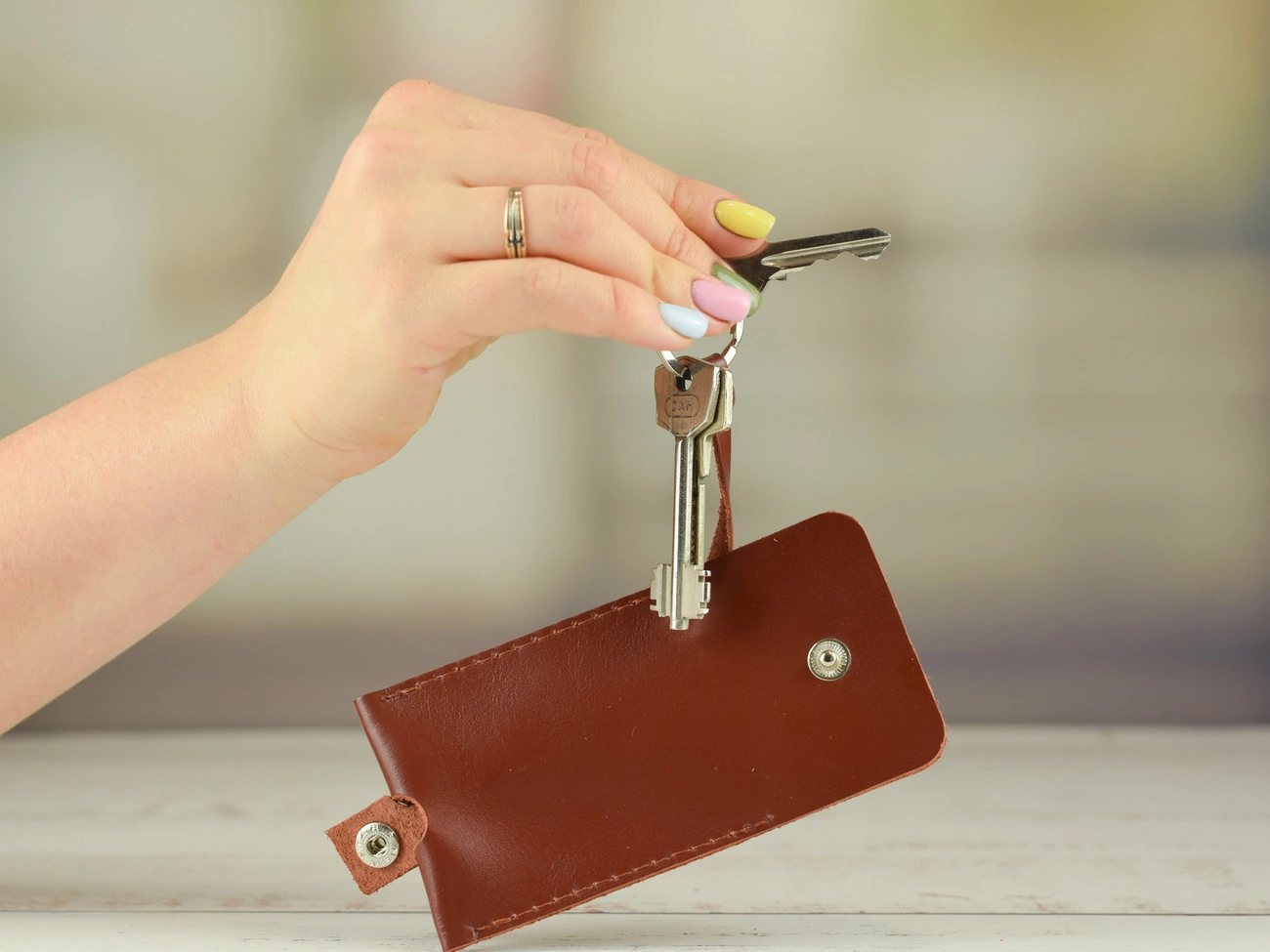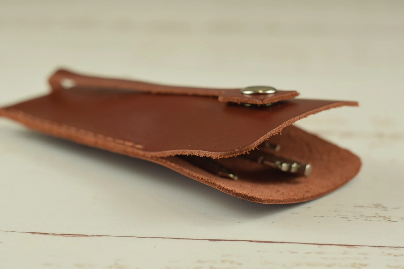 Компактна ключниця для невеликої кількості стандартних ключів. Закривається аксесуар за допомогою шкіряного ремінця, який фіксується металевою кнопкою. При певному навику може відкриватися і закриватися однією рукою, що дуже полегшує взаємодію з ключами.